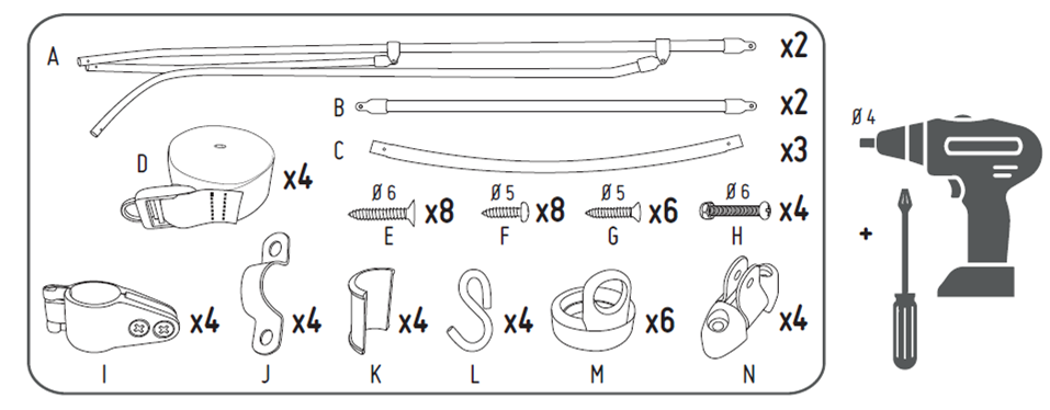 Tous les accessoires nécessaires pour fixer, maintenir et replier votre bimini sont inclus. Vous trouverez également une notice de montage téléchargeable sur cette page.