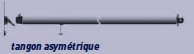 Le tangon asymétrique, n’est pas équipé de pantoires mais a la particularité d’avoir aux extrémités deux fixations qui permettent de capeler (accrocher) la balancine et le hale-bas. De l’autre côté on retrouve une cloche sur un chariot sur lequel on vient enclencher le tangon.