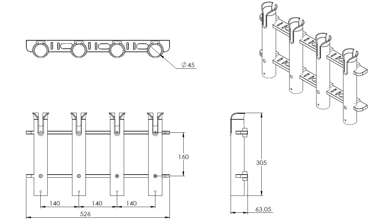 Porte canne quadruple en polypropylène à fixer sur cloison. Idéal pour pécher à la traine.